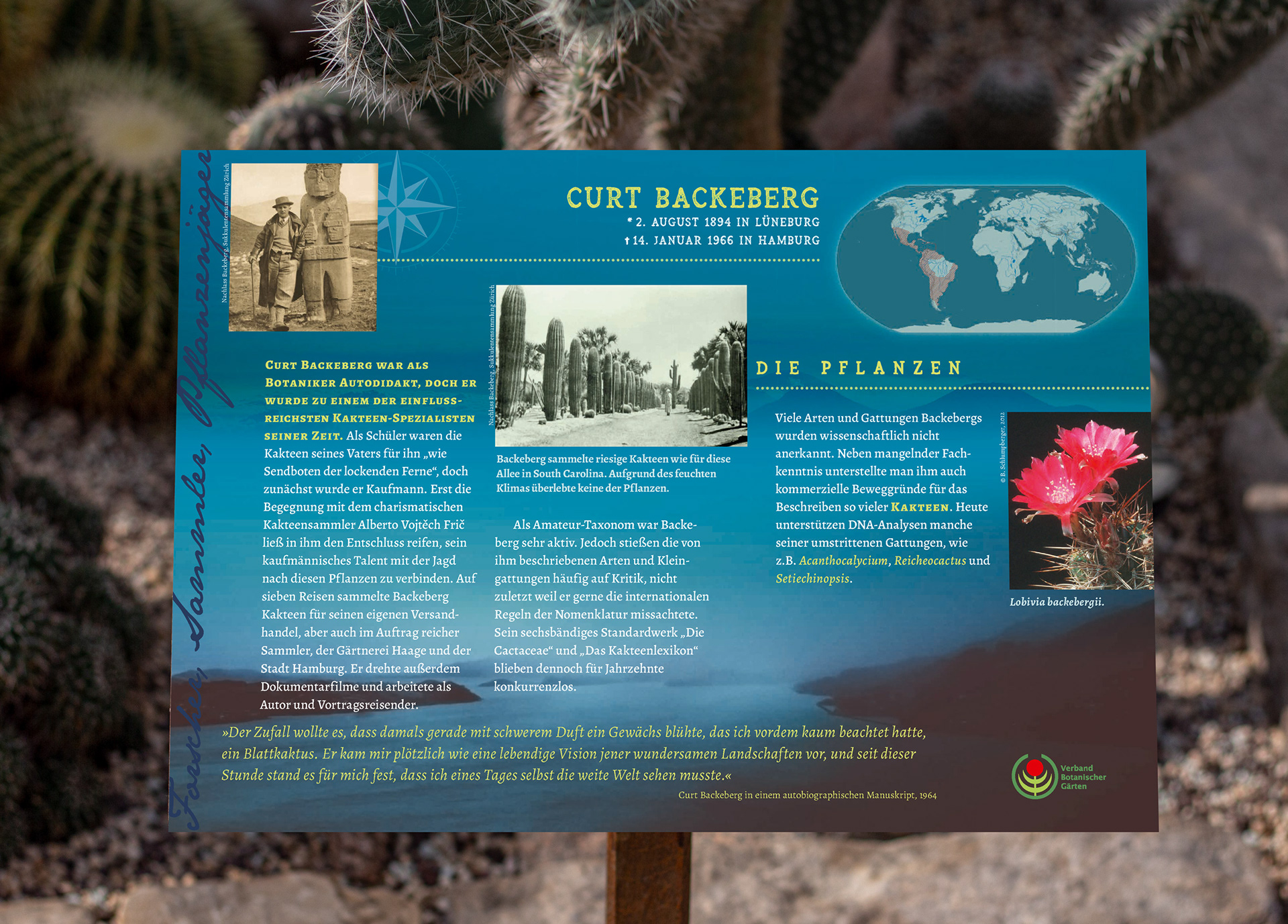 Humboldt war nur einer von vielen Pflanzenjäger*innen, die unsere Botanischen Gärten mit allerlei exotischen Pflanzen versorgt haben. Dabei riskierten sie Kopf und Kragen, erlebten Abenteuer und entdeckten botanisches und kulturelles Neuland. Wie ist das, wenn plötzlich eine neue Welt im Nebel auftaucht? Nebel, starke monochrome Farbigkeit und historisch anmutende Schriften begleiten die Ausstellung, die in vielen Botanischen Gärten 2019 und 2020 gezeigt wird. Flankiert von Plakaten, Tafeln, Steckbrief-Beschilderung, Ausstellungskatalog offenbart sich, was diese Menschen für die Botanik und Wissenschaft auf sich genommen haben.